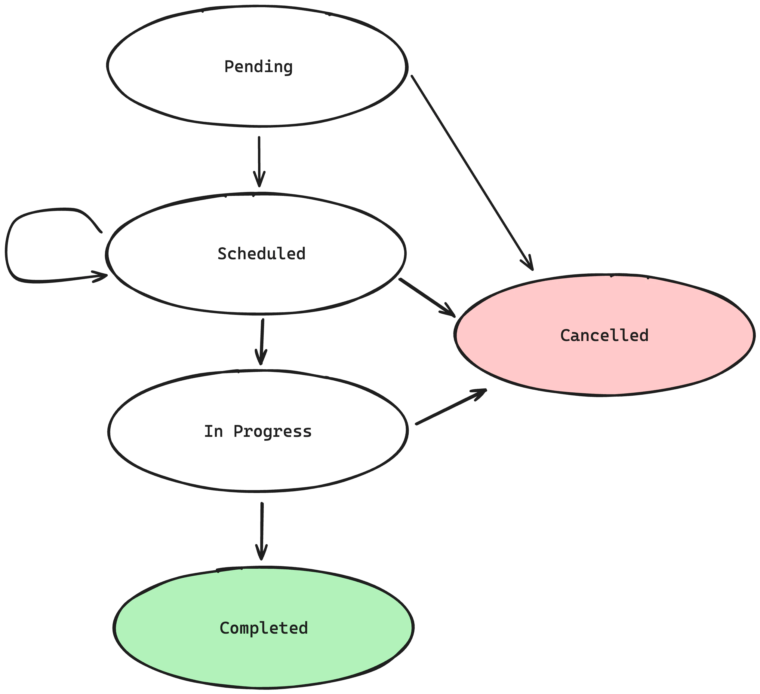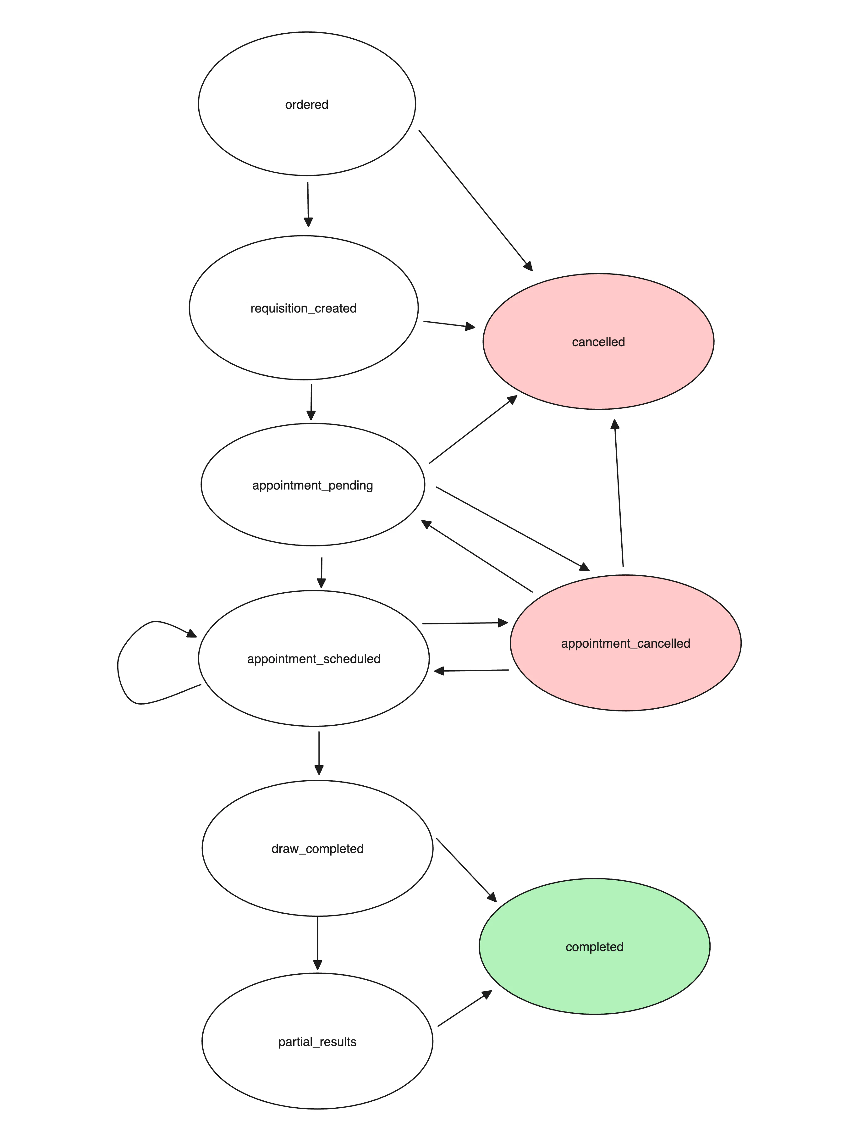 The Finite State Machine that defines the possible transitions for the appointment statuses described above is illustrated in the following diagram.